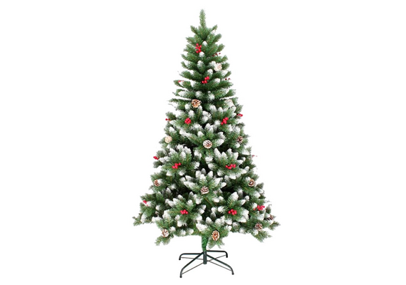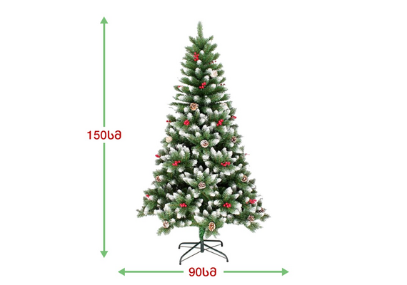 ნაძვის ხე დათოვლილი ბოლოებით, გაფორმებული გირჩებით და კენკრით. გამძლე დრეკადი მეტალის ტოტებით და ჯანმრთელობისთვის უსაფრთხო მასალისგან დამზადებული წიწვებით. მეტალის მყარი სადგამით და მთავარი ღერძით.