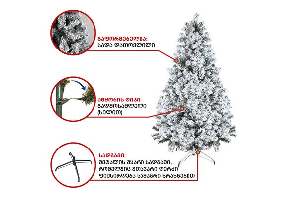 დათოვლილი ნაძვის ხე გამძლე დრეკადი მეტალის ტოტებით და ჯანმრთელობისთვის უსაფრთხო მასალისგან დამზადებული წიწვებით. მეტალის მყარი სადგამით და მთავარი ღერძით.