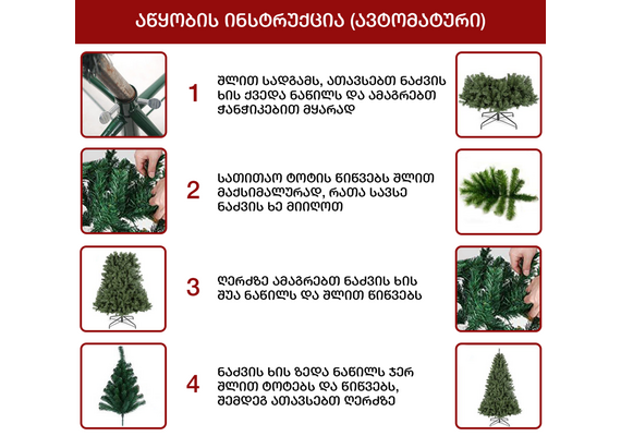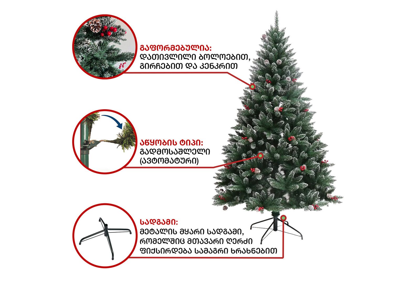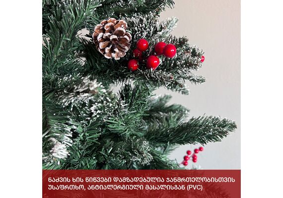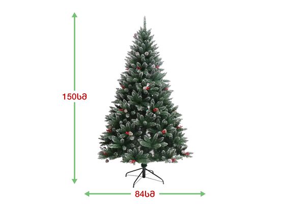 ნაძვის ხე დათოვლილი ბოლოებით, გაფორმებული გირჩებით და კენკრით. გამძლე დრეკადი მეტალის ტოტებით და ჯანმრთელობისთვის უსაფრთხო მასალისგან დამზადებული წიწვებით. მეტალის მყარი სადგამით და მთავარი ღერძით.