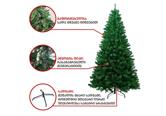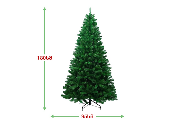 სადა მწვანე ნაძვის ხე გამძლე დრეკადი მეტალის ტოტებით და ჯანმრთელობისთვის უსაფრთხო მასალისგან დამზადებული წიწვებით. მეტალის მყარი სადგამით და მთავარი ღერძით.