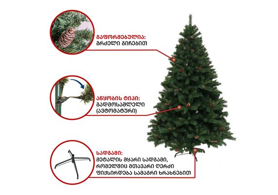 • გაფორმებული გირჩებით, გამძლე დრეკადი მეტალის ტოტებით და ჯანმრთელობისთვის უსაფრთხო მასალისგან დამზადებული წიწვებით.