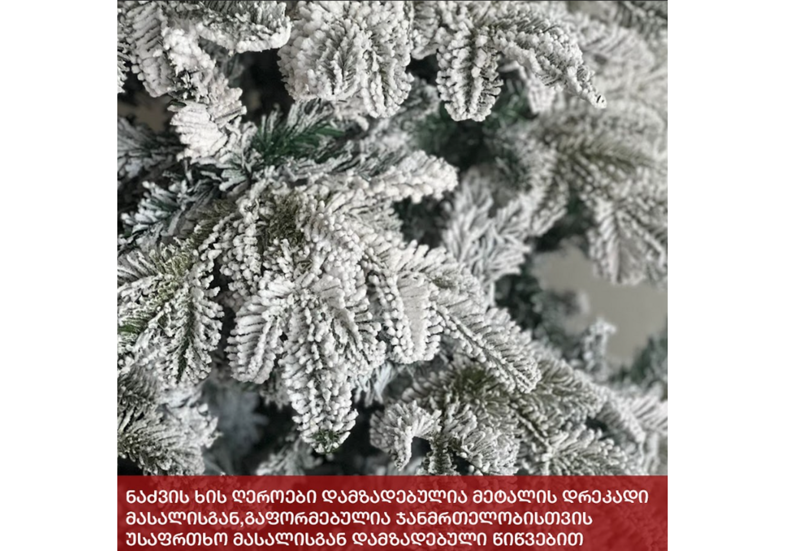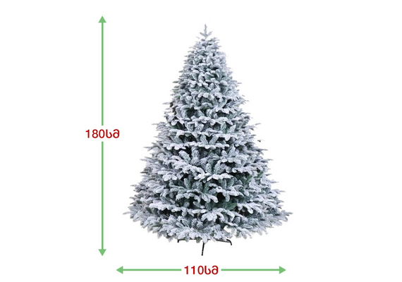 დათოვლილი ბუნებრივის მსგავსი ნაძვის ხე,გამძლე დრეკადი მეტალის ტოტებით და ჯანმრთელობისთვის უსაფრთხო მასალისგან დამზადებული სილიკონის და PVC წიწვებით. მეტალის მყარი სადგამით და მთავარი ღერძით.