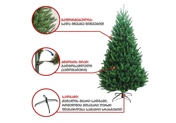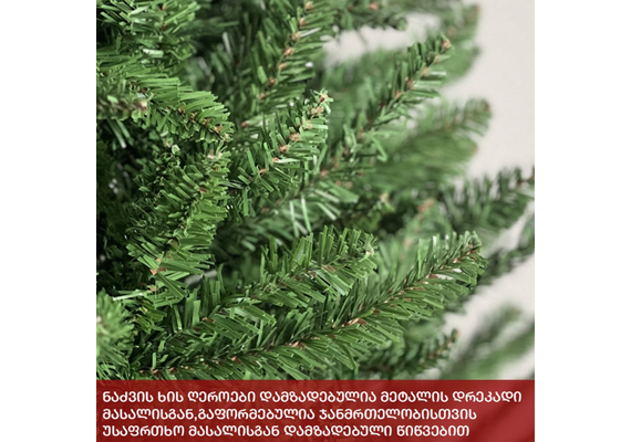 პრემიუმ ხარისხის, დაბურული მწვანე სადა ნაძვის ხე გამძლე დრეკადი მეტალის ტოტებით და ჯანმრთელობისთვის უსაფრთხო მასალისგან დამზადებული წიწვებით. მეტალის მყარი სადგამით და მთავარი ღერძით.