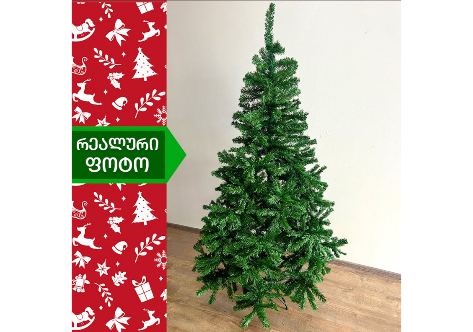 სადა მწვანე ნაძვის ხე გამძლე დრეკადი მეტალის ტოტებით და ჯანმრთელობისთვის უსაფრთხო მასალისგან დამზადებული წიწვებით. მეტალის მყარი სადგამით და მთავარი ღერძით.
