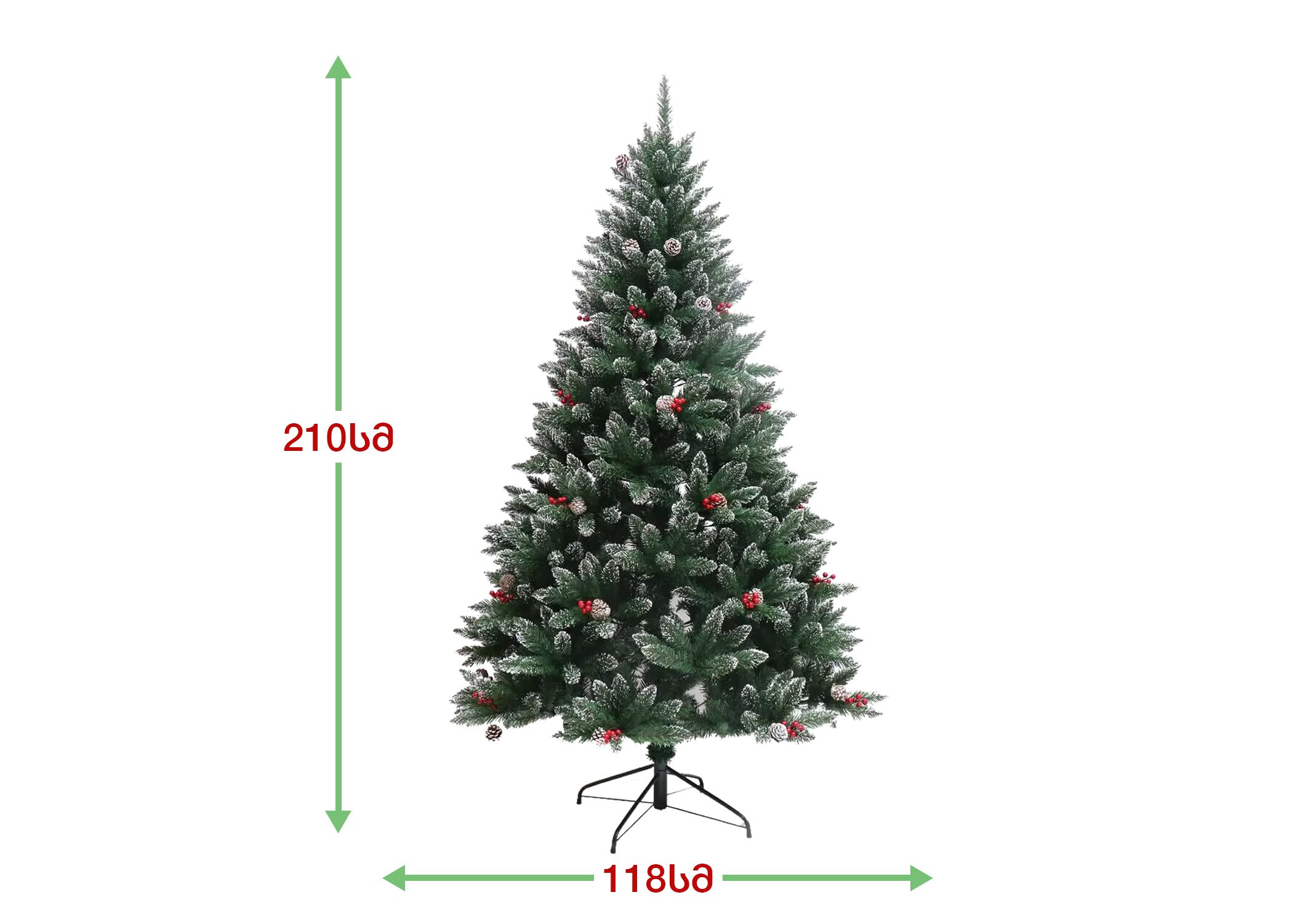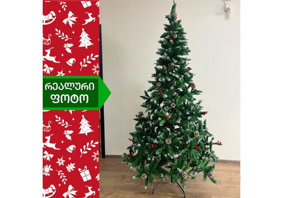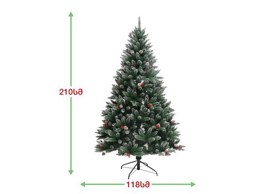 ნაძვის ხე დათოვლილი ბოლოებით, გაფორმებული გირჩებით და კენკრით. გამძლე დრეკადი მეტალის ტოტებით და ჯანმრთელობისთვის უსაფრთხო მასალისგან დამზადებული წიწვებით. მეტალის მყარი სადგამით და მთავარი ღერძით.