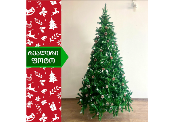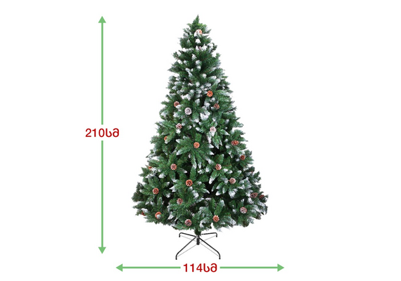 ნაძვის ხე დათოვლილი ბოლოებით, გაფორმებული გირჩებით. გამძლე დრეკადი მეტალის ტოტებით და ჯანმრთელობისთვის უსაფრთხო მასალისგან დამზადებული წიწვებით. მეტალის მყარი სადგამით და მთავარი ღერძით.