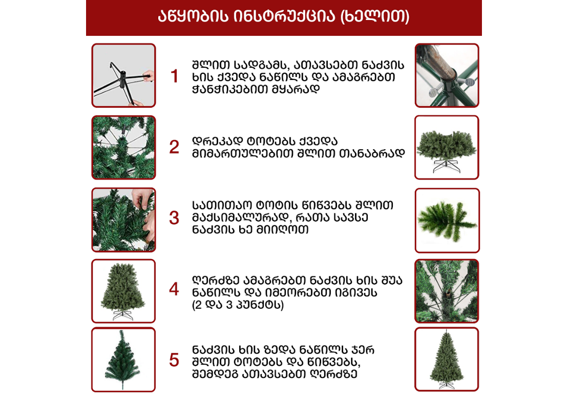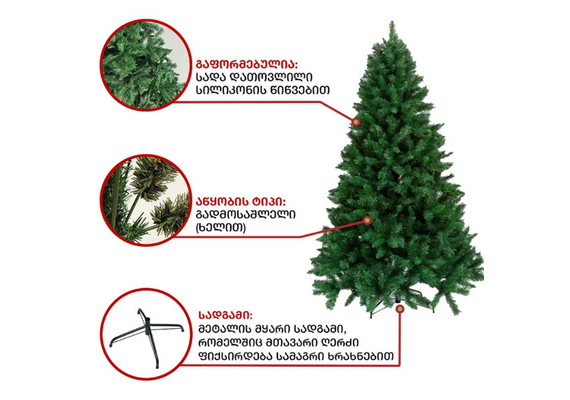 სადა მწვანე ნაძვის ხე გამძლე დრეკადი მეტალის ტოტებით და ჯანმრთელობისთვის უსაფრთხო მასალისგან დამზადებული წიწვებით. მეტალის მყარი სადგამით და მთავარი ღერძით.