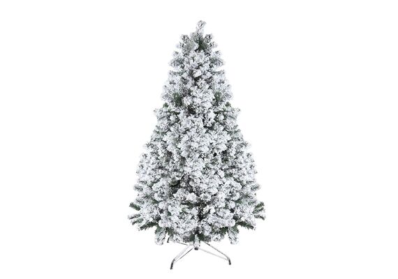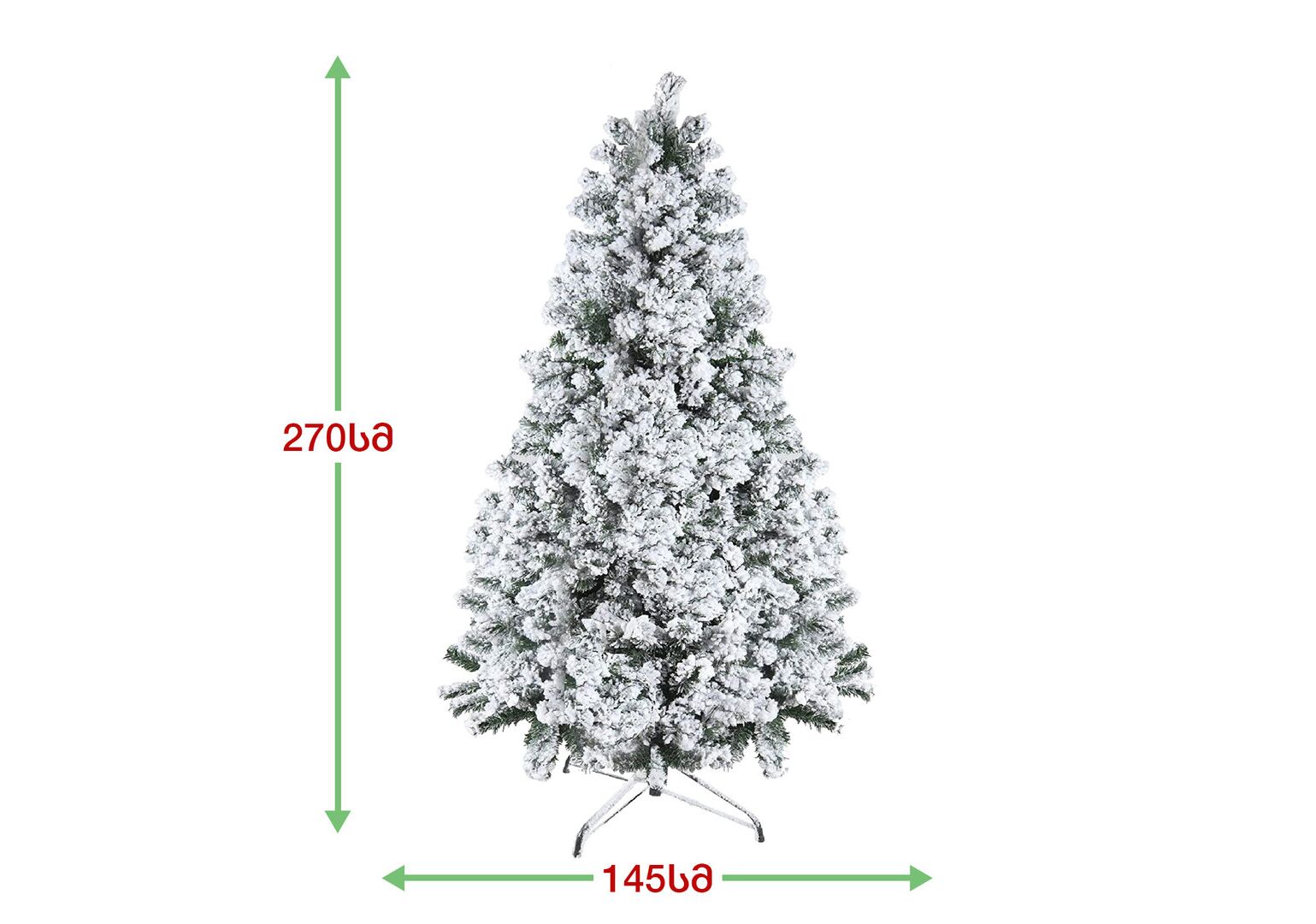 დათოვლილი ნაძვის ხე გამძლე დრეკადი მეტალის ტოტებით და ჯანმრთელობისთვის უსაფრთხო მასალისგან დამზადებული წიწვებით. მეტალის მყარი სადგამით და მთავარი ღერძით.