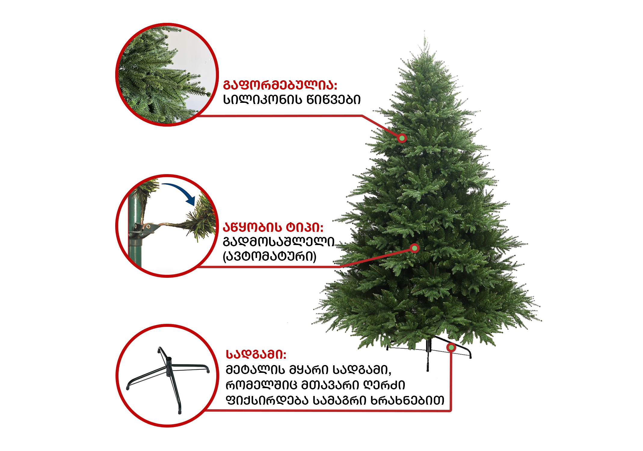 ბუნებრივის მსგავსი ნაძვის ხე, დრეკადი მეტალის ტოტებით და ჯანმრთელობისთვის უსაფრთხო მასალისგან დამზადებული შერეული ორი ფერის, სილიკონის და PVC წიწვით . მეტალის მყარი სადგამით და მთავარი ღერძით.