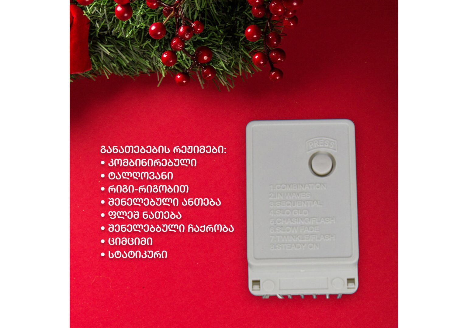 უსაფრთხო და საიმედო საახალწლო განათება განკუთვნილია ნაძვის ხის, კედლების, ფანჯრების და ნებისმიერი გარემოს გასანათებლად. განათება მოიხმარს დაბალ ენერგიას, ამიტომაც შეგიძლიათ ეკონომია არ გააკეთოთ მასზე და საახალწლო პერიოდში შეუზღუდავად აიმაღლოთ განწყობა. გამოსაყენებლად ძალიან მარტივი და პრაქტიკულია, მხოლოდ ერთი ღილაკი აქვს, რომლის საშუალებითაც შეცვლით ნათების რეჟიმს. განათების კაბელი წყალგამძლეა, მაგრამ მაკონტროლებელი არა. ამიტომ გარეთ გამოყენებამდე შეფუთეთ მაკონტროლებელი აუცილებლად.